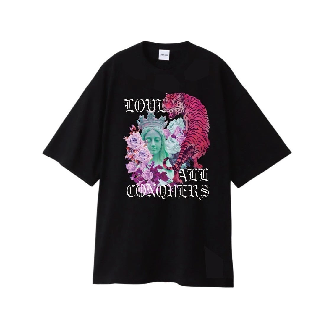 フロントに配されたのは、静かに目を閉じる女神像と、咆哮する紅の虎。そしてその周囲を彩る花々。古典的モチーフを鮮やかな配色で再構築し、メッセージ「LOVE CONQUERS ALL(愛はすべてを征服する)」を強く打ち出しました。